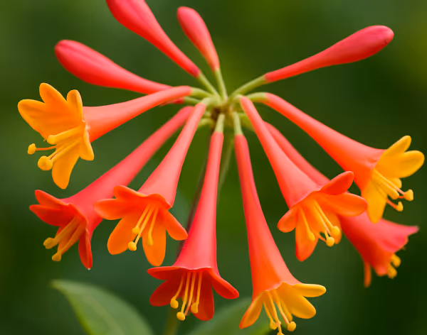 Tubular red/yellow flowers feed hummingbirds, host plant, not aggressive.
