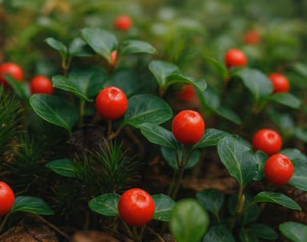 Bright red berries feed winter birds, striking in snow, adaptable to wet/dry.